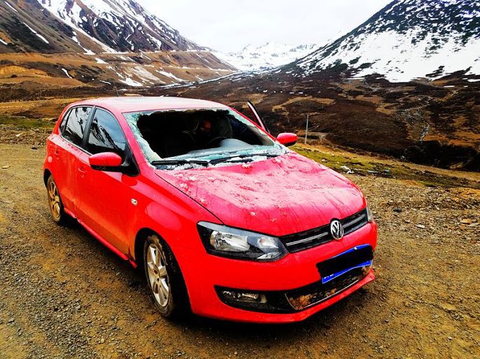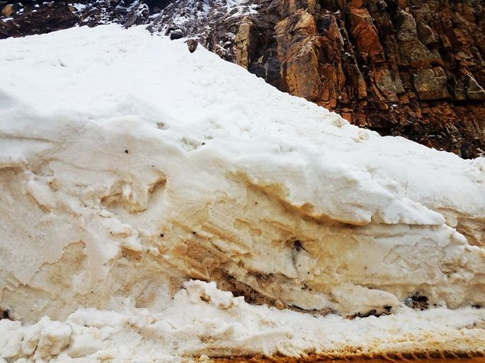 不过,在翻第二座雪山嘎达垭口途中,我们也曾与雪崩擦肩而过,差点经历惊险一幕,事情是这样的:就在我们行驶前方不远的一辆云南牌照的红色小车,没有顺利过清理出来的雪中通道,正欲往后倒车重试,一人在后面推车,这时位于他们一侧的高坡上突发雪崩,2人见势不妙,迅疾弃车往相反方向而逃,结果一人逃脱,一人被崩塌下来的大雪深埋至肩部,所幸救援及时,被成功救出了,人车均无大碍,只是前挡风玻璃被大雪砸碎,驾驶室内塞满了积雪……他们最终还是将这辆没有前挡风玻璃的车,一直开到了察隅县城的修理厂。