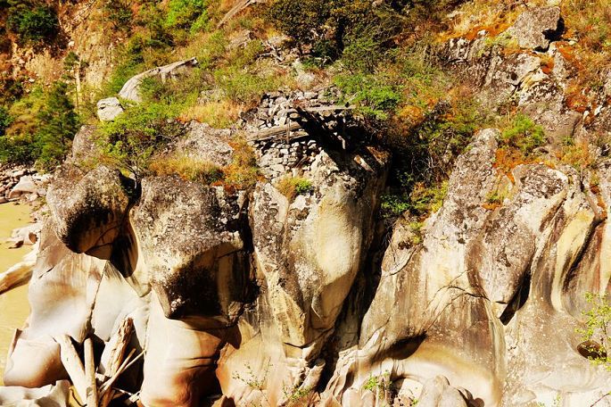 早起在酒店餐厅饭后,9:21出发,我们告别了察隅县,开始新的征程,沿桑曲河走S201省道,向西北方向继续前行。9:39到水磨岩,下车后走小路穿过一片树林,来到河岸悬崖边,俯瞰河床下经水流不断冲击下的两岸岩石,这些本是异常坚硬的岩石,在水流的千磨万击下,变得形态各异,形成如此奇观,让人不得不惊叹至柔之水的力量。
