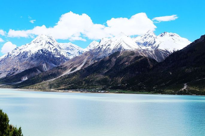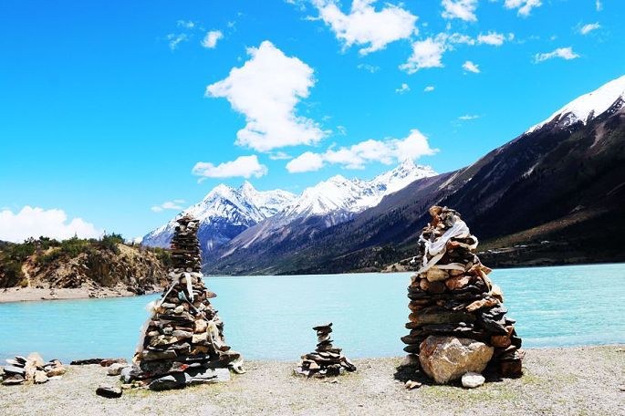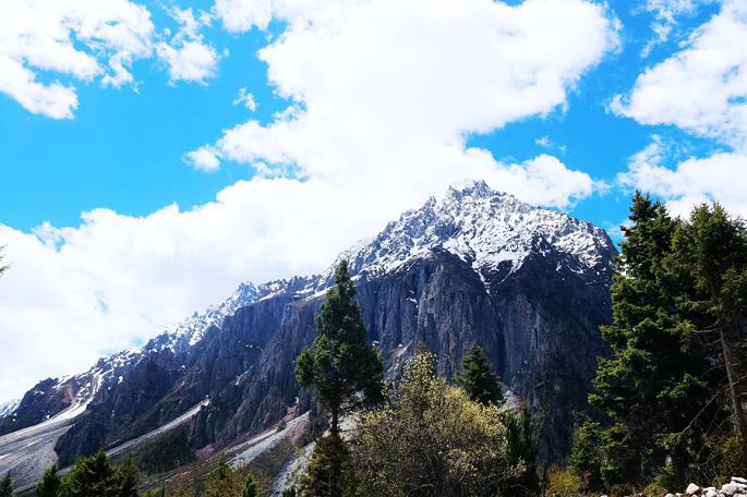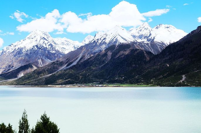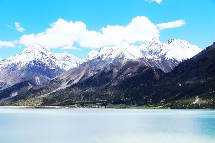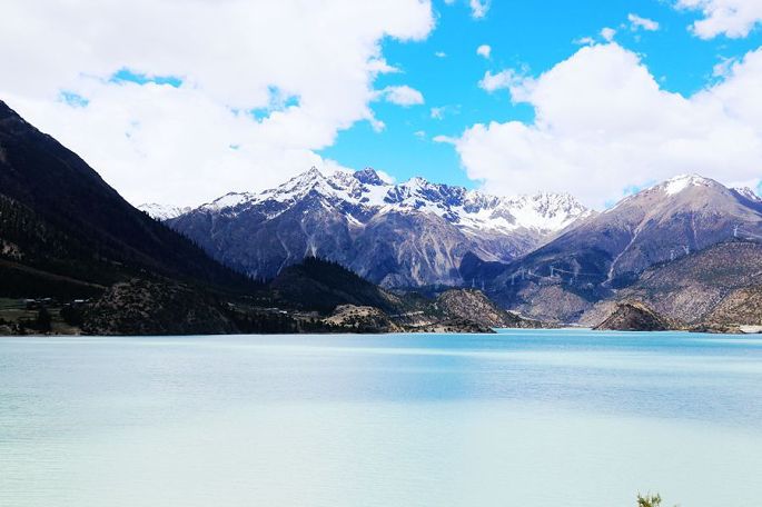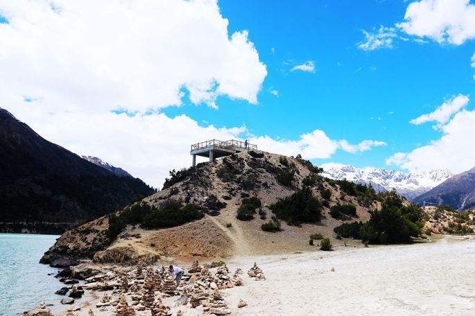 14:15到然乌湖(海拔3783米),去年三月春走川藏线时,曾游过然乌湖,今天就算是旧地重游,自然格外亲切了。还记得去年来这里时,山上还有不少积雪,湖中倒影与水墨风光,给我留下了难以忘怀的印象,不过当时这里的游人也多,湖边的那座观景台上更是人满为患,而今天我们来这里,同样的湖滨,还是那座观景台,却空无人影,似乎又是一个我们4人的专场。相比去年的三月,湖岸边雪山的雪际线明显升高了,五月的湖水更加幽蓝恬静,同样让人刻骨铭心!