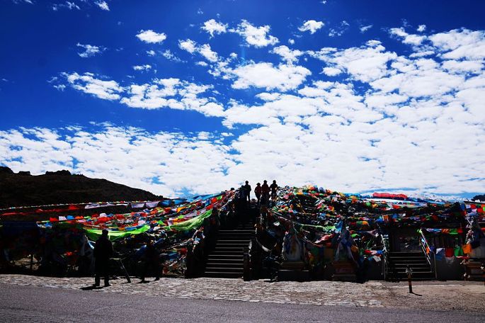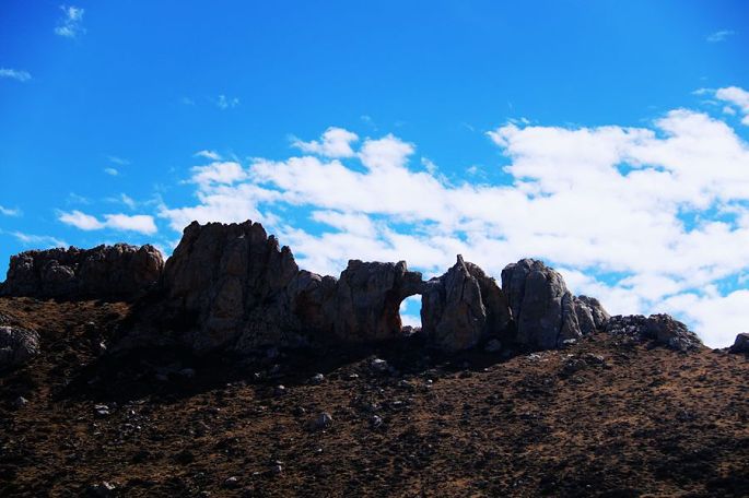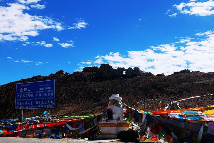 10:23到业拉山观景台(海拔4658米)。业拉山属横断山脉,从垭口到怒江峡谷底几十公里的路程落差竟达2000多米,真的是山高谷深啊!在业拉山顶还可观赏到一处造化的杰作——山顶石洞,关于这一天然石洞,有许多传说:有人说是当年藏王格萨尔为镇压妖魔,拔箭射出此石洞,以起到威慑作用;也有人说此石洞是上天之眼,为世人照亮前程,驱散厄运……