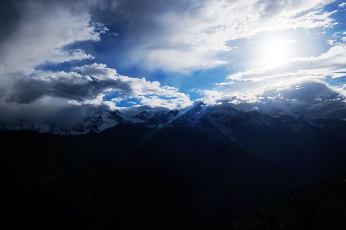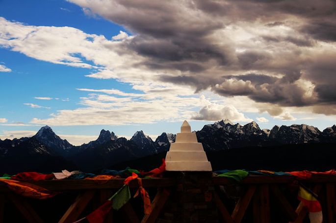 回到酒店,我们一直在遥望夕阳下、对面云雾缭绕之中的雪山,期望能一睹卡瓦格博神山的真容,终于不负我们所望,20:30神山果然露出了她的真容,虽然只有短短的一瞬,很快就又被浓云裹住了。
