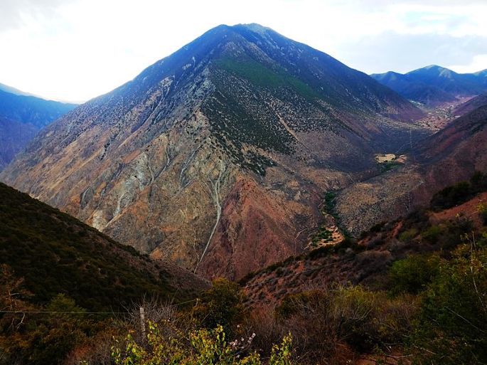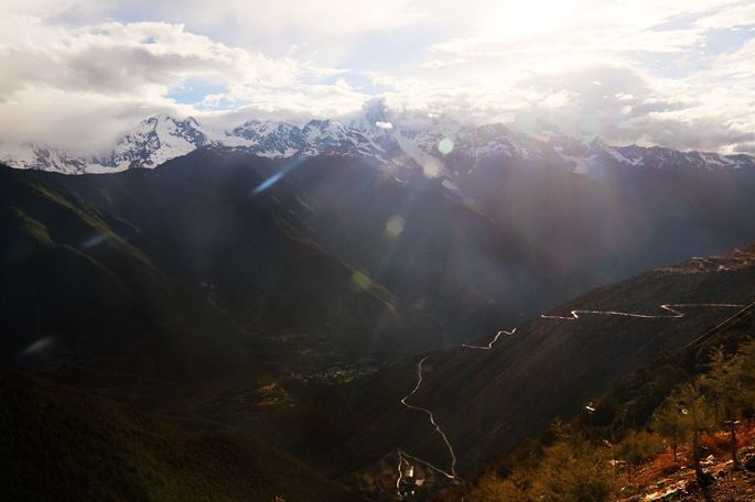 早餐后,8:58我们乘车离开飞来寺景区,沿214滇藏线南下,经德钦县城,翻白马雪山(海拔4294米),11:00到奔子栏镇的金沙江峡谷和金沙江大湾观景台,眺望金沙江大拐弯,据说对面就是四川的德荣县。