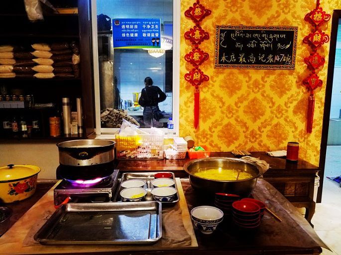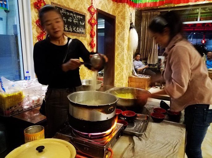 早起收拾后,小黑带我们去镇上中心小学旁边一家藏餐馆吃早餐,吃的是藏式小面、小笼包子,喝的是甜茶。