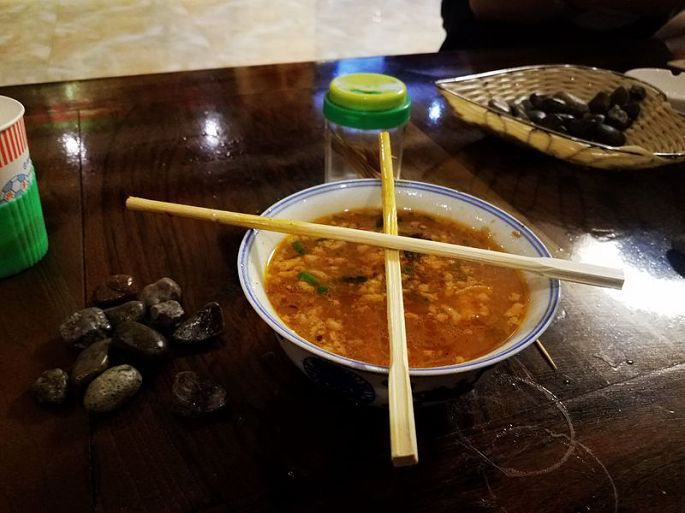 佳加面起初就叫“加加面”,后来也叫“佳加面”、“加家面”、“佳家面”的,名字不同,寓意也不完全一样。一人25元,随便吃多少,吃完一碗,服务员马上就会给你添加一碗,说是一碗,其实也就一筷子几根面条,桌上的小石子是用来计数的,吃一碗往自己面前放上一颗小石子,如果吃不了了,就把筷子交叉成十字放在碗上,服务员就不会为你的碗里继续添加了,据说目前最高纪录为147碗,而我只吃了13碗便实在吃不下了,就是在同行几个小伙伴里也是吃得最少的,真是有些小巫见大巫了!