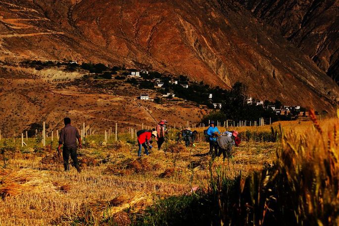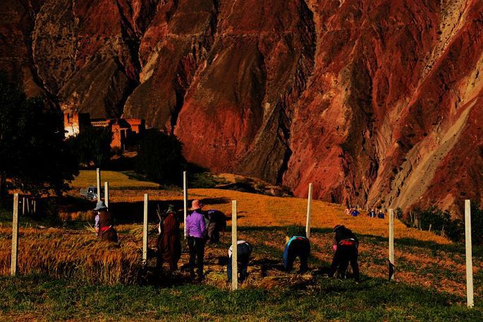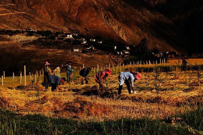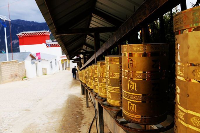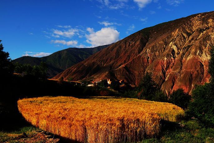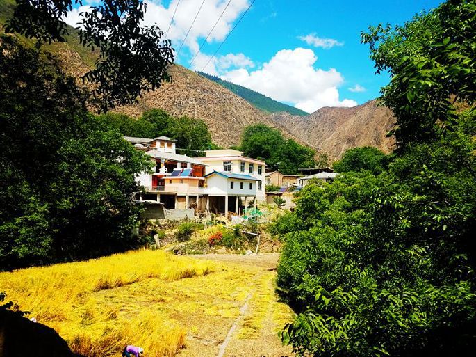 早起之后,7:30与小乙一起出去,先上酒店附近的一座白塔,和当地村民一起转了三圈白塔,再走进纳西村里(看村口的标牌,属内地重庆对口援建的),田间地头,小巷院落,四处走走看看,知道村民都是纳西族,但我实在看不出他们的民居与藏族民居有多大的不同,除了村容村貌的干净整洁,感觉这个村的确有些神奇,村里到处绿树成荫,花团锦簇,村民的房前院后,果树很多,苹果、石榴、核桃、梨子、葡萄等等都有,这个村子的小环境与他们四周高山枯寂荒芜的大环境,构成了强烈的反差。村外的地里头村民三三两两,正在紧张地忙着收割青稞,好一派澜沧江畔的田园风光。