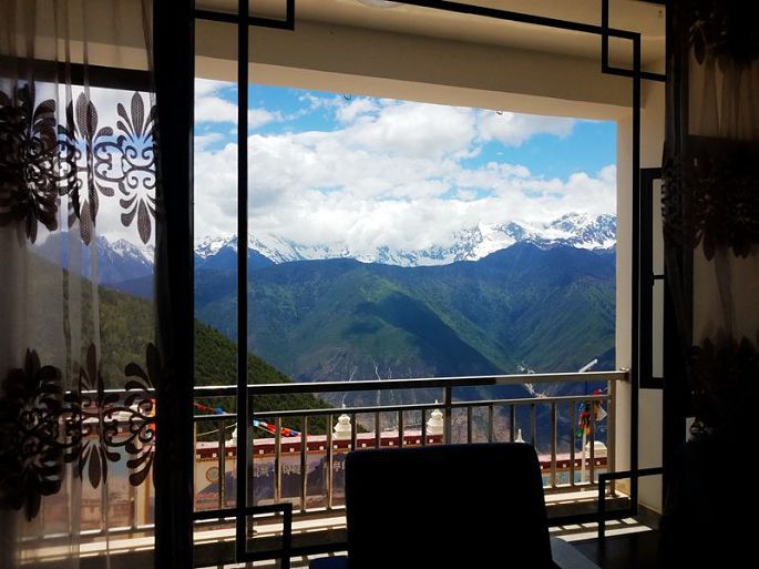 告别西当村,我们的车经大桥重又过澜沧江,沿盘山公路,蜿蜒而上,13:46我们来到了今天的目的地——位于山腰G214旁边的飞来寺景区,入住精品逸居酒店的观景房,阳台对面就是藏区八大神山之一的梅里雪山的主峰卡瓦格博峰(海拔6740米),它也是云南第一高峰,端把椅子,坐在阳台,遥望雪山,泡杯香茶,那真是心旷神怡,好不爽哉妙极,感觉太棒了……