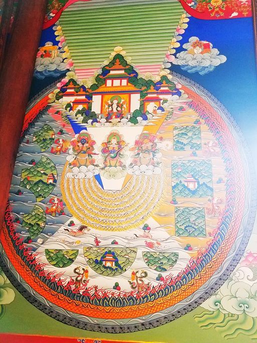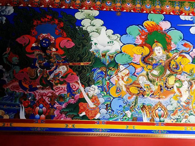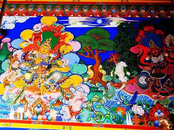 寺内壁画为清代创作,以门楣为界一分为二,分别为藏传佛教格鲁派和宁玛派师承以及护法诸尊,其间还有原始宗教和自然崇拜及当地藏民世俗生活的场景,色彩鲜艳,精美绝伦,虽然我最终也没有看明白画的具体内容……