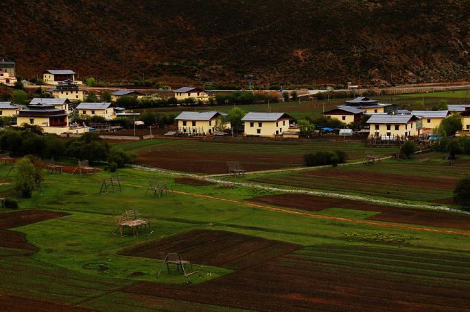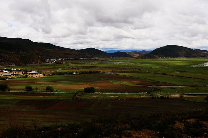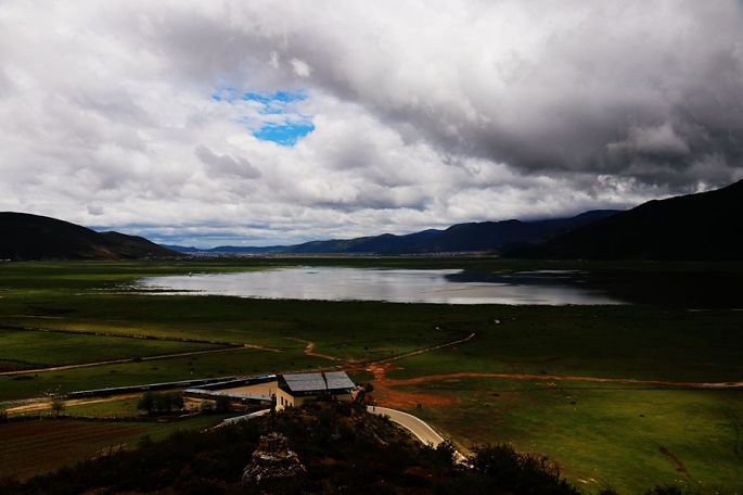 12:20到伊拉草原观景点,宁静的纳帕海畔,是一望无际的依拉草原,平坦的原野上,散落着一座座两层的藏式民居,一块块的长方形土地,或纵或横,还有一个个晾晒青稞的木架子点缀其间,湖边草地上则是星星点点般的马儿、牛儿正在低头吃草……一幅典型的属于藏区的田园风光画卷。