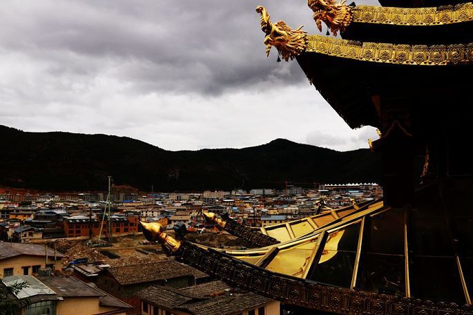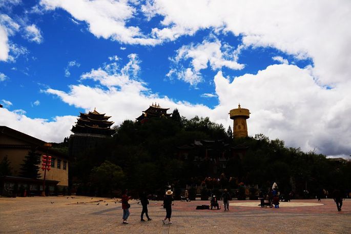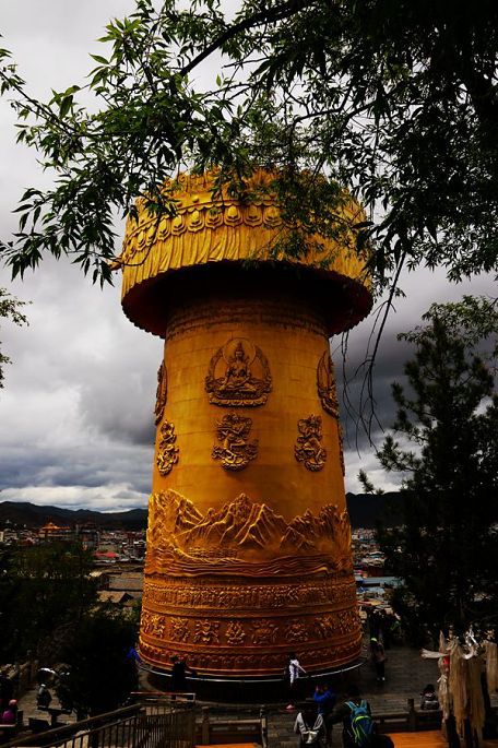 在酒店稍事休息后,下午2点多,我们一行4人相约来到了龟山公园,登上山顶,这里能俯瞰古城全貌乃至整个香格里拉市的全貌,我们还与其他游人一起转动了那个大大的金色转经筒,如此巨大的转经筒,令人叹为观止!