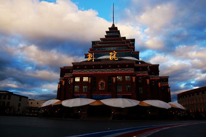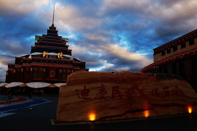 回到酒店,在楼下一家重庆餐馆吃过晚餐后,我们出去散步,市区内一处鹤立鸡群似的奇特建筑,引起了我们的好奇心,决定去跟前看看,反正市区也不大,走不了多远的,不知不觉就走到了迪庆州民族文化广场,围着似乎是新建的大剧院转了一大圈,色彩靓丽而造型又极富民族特色的大剧院建筑,真的堪称高、大、上。