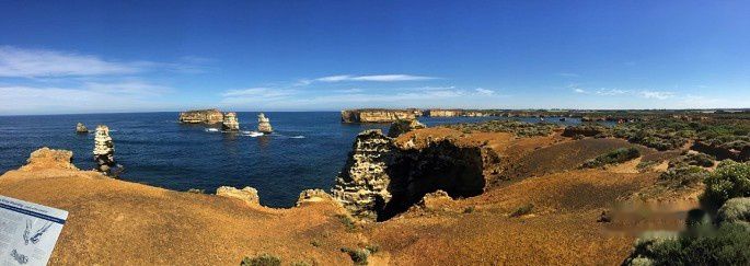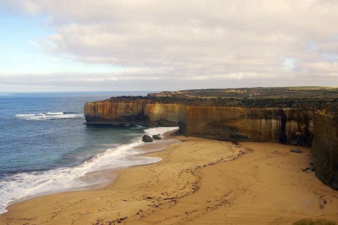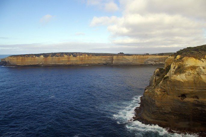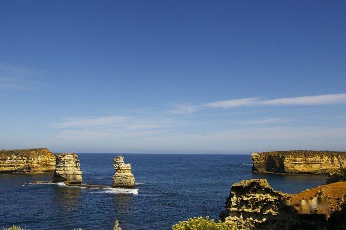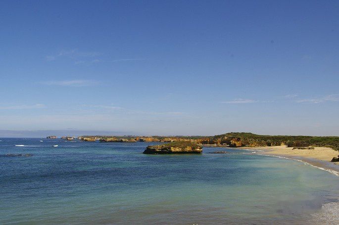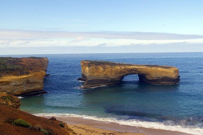 继续往前是有名的“伦敦桥”:一座曾经是完整孤独伸入海中的“桥”,但在1990年1月15日这一天,由于海蚀和风蚀作用的不断蚕食,桥的中部轰然坍塌,成为如今的“断桥”,与其相伴的除了崖岸,还有金色的沙滩。