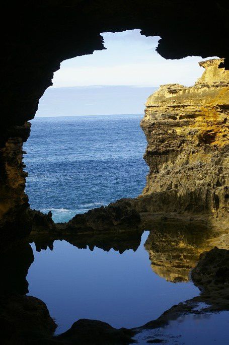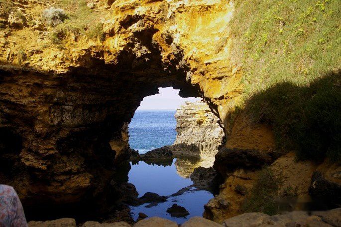 过了“伦敦桥”,公路渐离荒凉的海岸,不久一块“The Grotto”(穴岩)的景点标志牌出现在路边。下车后,沿着砂砾小路步行10分钟左右到达“穴岩”——大自然鬼斧神工的美丽景观:被风化水蚀的海岸。