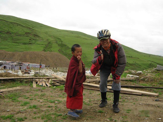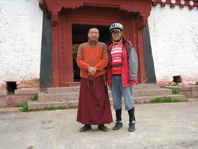 早7点半起来,轻车前往城北山冈上的理塘长青春科尔寺,不知道寺名什么含义。快到科尔寺,就见几个藏族娃娃,穿着暗红色袈裟在往寺里走。寺庙在扩建,好像全国都如此。所有殿宇依山而建,错落无致。寺内红衣喇嘛自几岁到几十岁不等,像是一所学校,大清早的,还有寺外成人过来,估计是家长。在大法寺图书馆门前见到一位喇嘛,40多岁的样子,通过聊天知道,他是大法师,相当于学校教导主任,管理着寺内小喇嘛们诵经及生活。我和他合了一张照片,然后下山。后来在别处遇到几个喇嘛,拿出照片让他们看,说知道,他叫强巴。