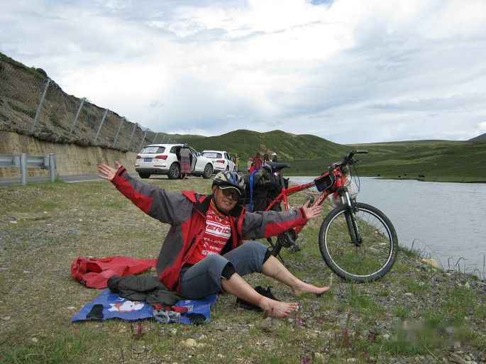 不久雨过天晴,路上的雨经常这样,来去无踪。继续赶路。3点半到无量河边,大石碑上写着:无量河国家湿地公园。心想这河是不是与佛有关?拍照过后便在河边找了一处草地停车休息,晒太阳,顺便把淋湿的鞋袜衣服都脱下来,晒在草地上,感觉跟西游记里师徒过哪条河的情形相似。无量河两边从头至尾没有一棵树。