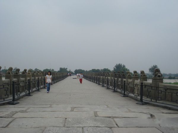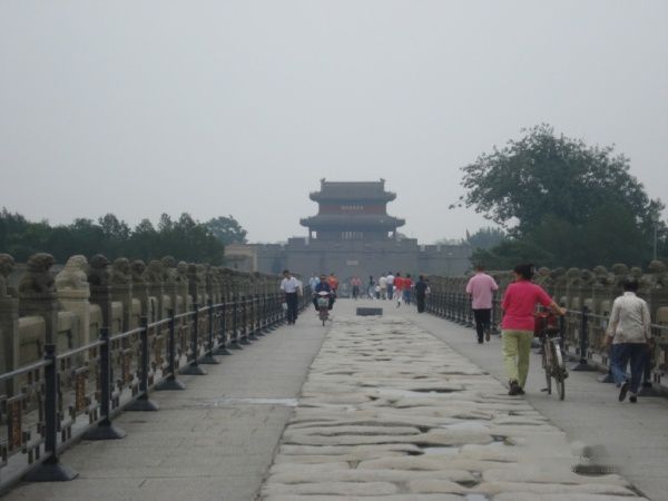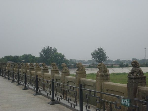 在北京市西南约15公里丰台区永定河上,是北京市现存最古老的石造联拱桥。永定河旧称卢沟河,桥亦以卢沟命名。始建于金大定二十九年(1189年),明正统九年(1444年)重修。清康熙时毁于洪水,康熙三十七年(1698年)重建。桥全长266.5米,宽7.5米,下分十一个涵孔。桥身两侧石雕护栏各有望柱140根,柱头上均雕有卧伏的大小石狮共501个(卢沟桥文物保护部门提供数据),神态各异,栩栩如生。桥东的碑亭内立有清乾隆题“卢沟晓月”汉白玉碑,为燕京八景之一。意大利旅行家马可·波罗在他的游记中称赞“它是世界上最好的、独一无二的桥”。桥东为宛平县城,明崇祯十一年(1638年)建。1937年7月7日,日本帝国主义在此发动全面侵华战争。宛平城的中国驻军奋起抵抗,史称“卢沟桥事变”(亦称“七七事变”)。