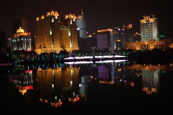 家里的饭菜总是令人忍不住吃得过多,晚饭后吃撑了的老陈只好出去转转,消消食,顺便拍点夜景。弟弟开着车先到了民歌湖附近。