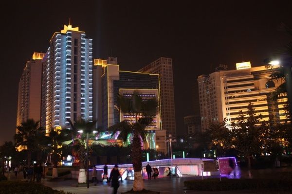 五彩的霓虹,四周高大的建筑。