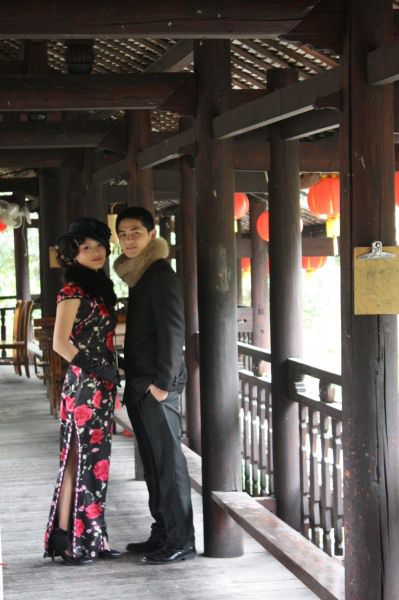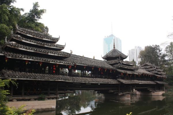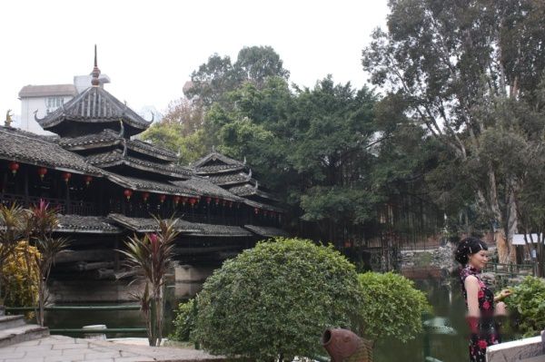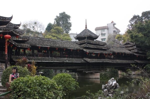 身着旗袍婀娜多姿的美女,与侗乡风雨桥共同构成了绝美的画面。