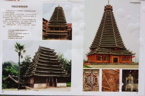 一棵棵棕榈树上悬挂着一幅幅的广西民居原生态文化影像图片。风格造型独特的鼓楼。