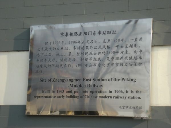 京奉铁路又称关内外铁路,起于北京正阳门东车站,止于奉天(沈阳)站,长842公里。京奉铁路正阳门东车站,俗称北京站,也叫前门站,它的修建与西方列强侵略中国密不可分。清光绪二十三年(1897年)津卢铁路竣工通车。该路由天津站到卢沟桥。铁路修至丰台时,引出一条丰台至马家堡的铁路。光绪二十六年(1900年),八国联军侵略中国。1901年,英国侵略军强行将津卢铁路从马家堡延展至正阳门(即前门),开始修建“京奉铁路正阳门东车站”,1906年竣工并开通使用。它是当时全国最大的火车站。车站站房建筑面积3500平方米。站内三座站台,其中两座有风雨棚。站台长度377米,设有普通旅客和头、二等旅客候车厅。候车厅总面积达1500平方米。还设有客票房、问事房、行李房和旅客用公用电话、无线电报等设施。在正阳门外右侧,也就是正阳门东站的对面,还有个正阳西站,是平汉铁路的起点,1958年拆除。