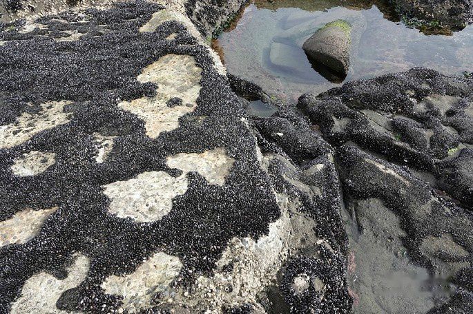 海滩上的石头长满了贝类,好像是海虹