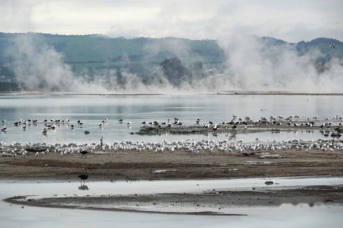 硫磺湖边有不少水鸟(黑背鸥与紫水鸡)