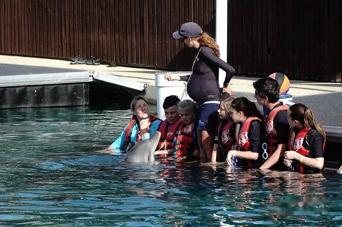 下午3点,看海豚训练。这大概是热心游客或者是志愿者,也许则是专门报名的。由两名老师各带6~7个学员,在水中与海豚亲密接触,怪好玩的。