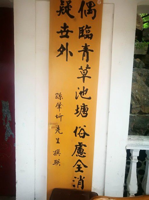 对联:偶临青草池塘,俗虑全消疑世外;闲试白沙泉水,清流有数只山中。