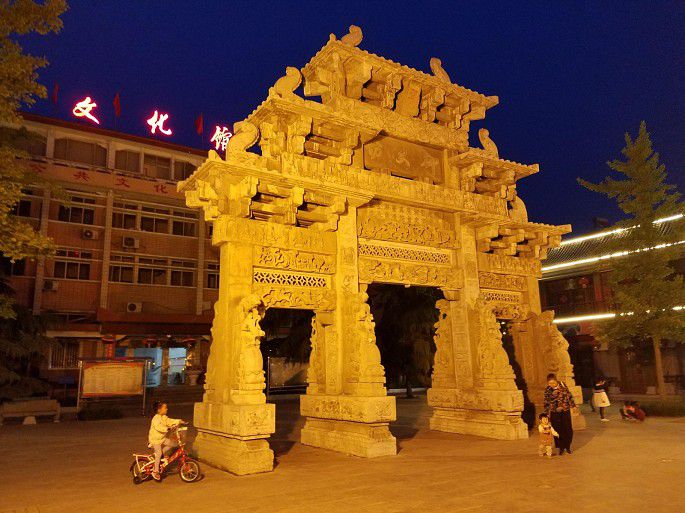 街隔壁即是文庙,已关门谢客。天色近晚,南行不远到永安广场。樊牛飞刀面老店吃东西,还不错。老巷就近住下,见文化馆前御史牌坊闪亮,又是一番味道。