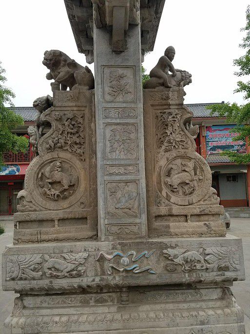 先去北洞(药王庙),山道两侧各色造型的拴马桩,一天门阁楼依山而立,如空中楼阁,楼前一对铁旗杆和石虎一对。药王大殿后是洗药池和财神殿,财神殿内临墙立着一些雕饰精美人物、鸟兽、花卉的拴马桩,小亭子里面置一座佛塔,上遍布造像,是从其他地方搬迁过来的。