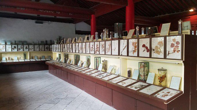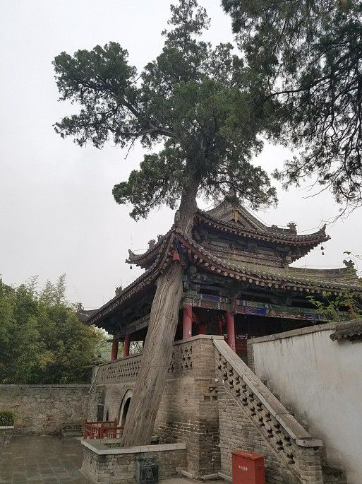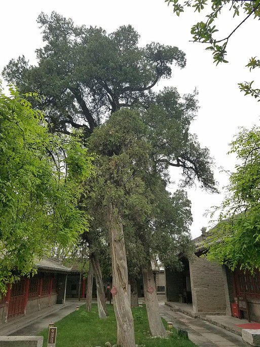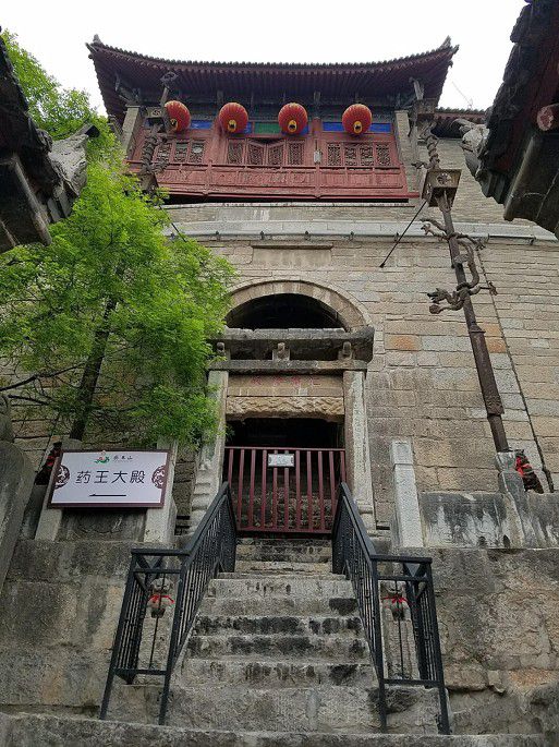 下到山间正路,过一古桥,往对面山上走,南庵所在。南庵和北洞隔沟相望,孙思邈隐居地,也是药王山最早的建筑。此处较药王庙开阔得多,主要有文昌阁、戏楼、七间殿、金殿、元殿等建筑,以及广场上高大的孙思邈塑像和几株沧桑古柏。七间殿内有中药材标本展览,文昌阁一角有古柏穿破向天,令人叫绝!