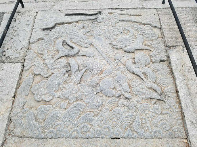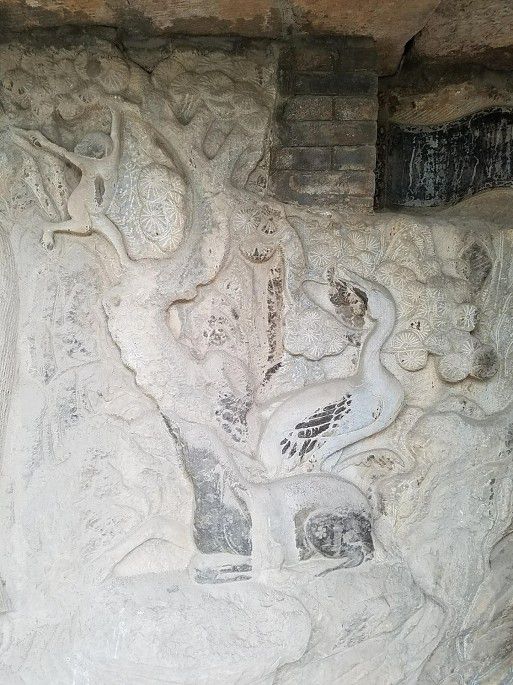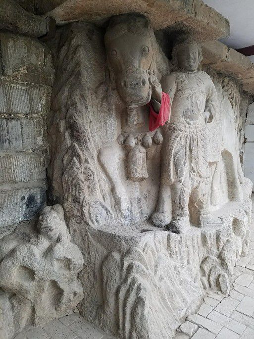 随后到关帝庙石刻,关平手牵赤兔马威风八面,而庙已不存。马后为松、竹浮雕,松下麋鹿,松上猿猴,一鹤欲飞.....
