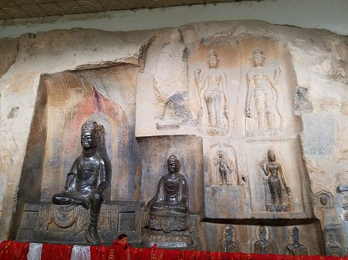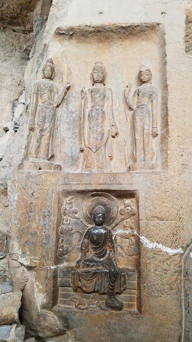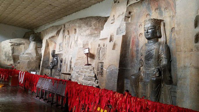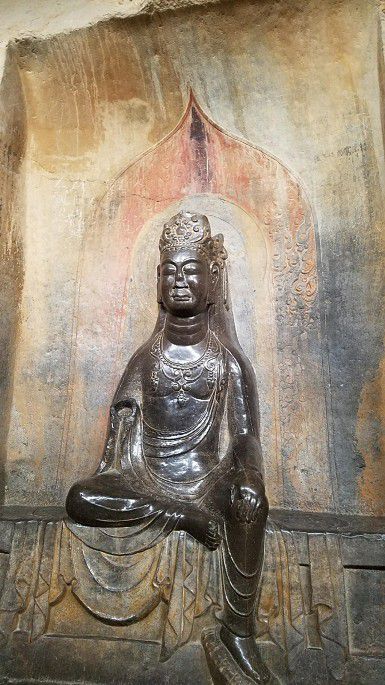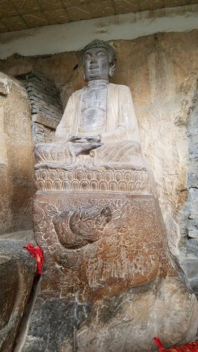 摩崖造像与此相邻,有后建大厅保护。造像主题丰富,如各方菩萨、阿弥陀佛、弥勒佛、华严三圣等。造像黝黑发亮,俗称“摸摸佛”——相传抚摸造像身上某部位,就可以祛除身体同一部位病痛1,所以其全身被摸磨得油光闪亮,让人有一丝“诡异”之感呵~~~当然,现在保护起来,摸不得了。