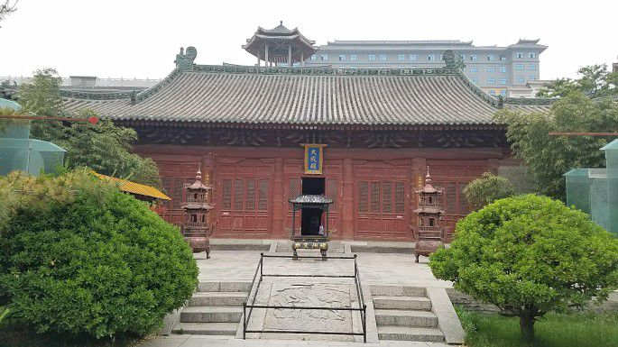 大成殿位于最北端,气势雄伟。自北宋创建后经历了十余次维修,使其兼具了各个时代的建筑特点,具有很高的观赏和科研价值。庙内大成殿的陛石还是非常漂亮。殿前草坪上有一座残破的北周石佛立像。