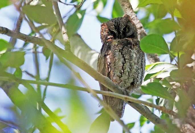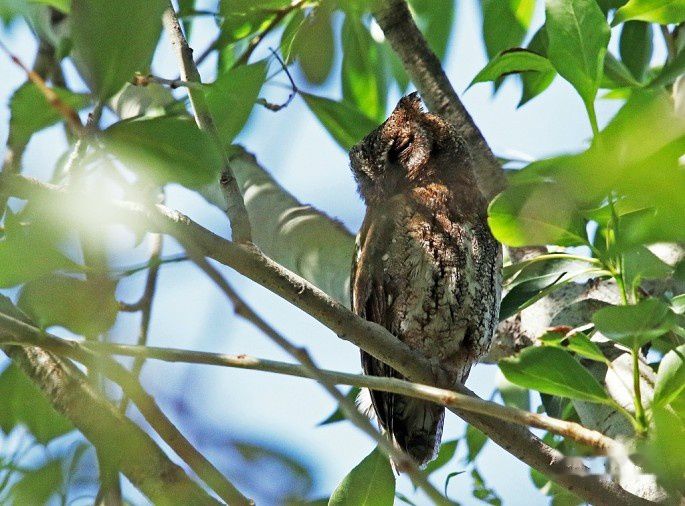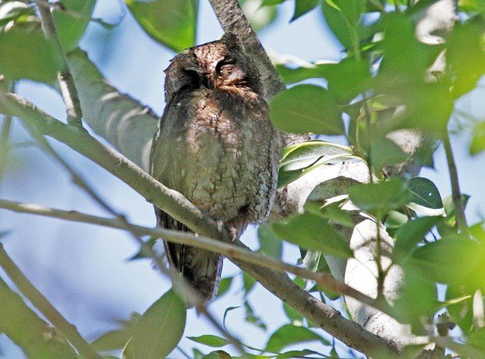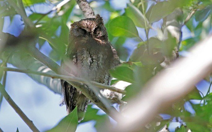 结果到了梁启超墓一看,东方角鸮已不见踪影,有鸟友说是昨天有人用弹弓将鸟打跑了。真的令人失望,那打鸟的也太可恶了!无奈再往西边去找,溜溜转了几个圈,最终找到了,是在半山腰的一棵树上。但是比昨天更难拍,且一直睡觉,鲜有睁眼。
