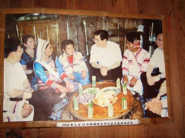 在卓巴(寨主长老)居住的房屋的墙上, 看到1989年11月18日和2006年5月12日,江泽民、胡锦涛总书记先后考察基诺山乡巴坡村、札吕村的照片。山寨的导游姑娘在讲解时,流露出真诚的感激之心。现在基诺族村寨都已通上了公路和电灯,边上就是主席的干儿子,目前在北京读书,费用都是主席出,我想,主席认他做儿子不单单是帮助他走出大山,我想,更多的是他承载的责任和义务吧,应该是希望他将来能够为基诺人做出贡献,