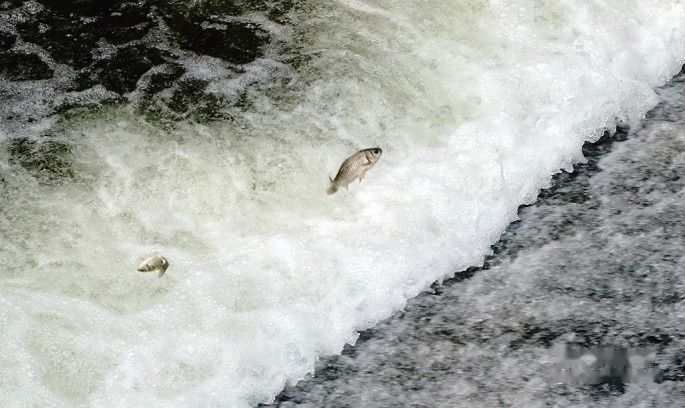 这两处水坝是从玉渊潭东湖流出来的水,经过大沟流到八一湖的。北面第一道水坝落差50多厘米,加上斜坡宽度则有2米多,鱼儿基本上无法跃上去,因为即使跃到了水坝上,也无法在斜坡上停留,又会被激流冲回原处。而第二道水坝落差有30厘米左右,是直上直下的,因此会有鱼儿跃上这道水坝。尽管成功率不高,但起码也有10%的希望,因为我看的半个小时中还是有一些鱼儿越过去了。
