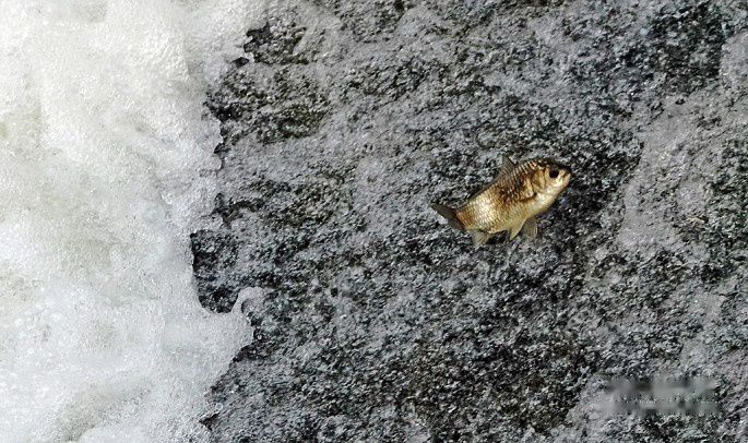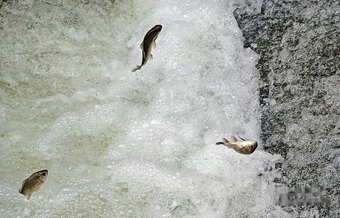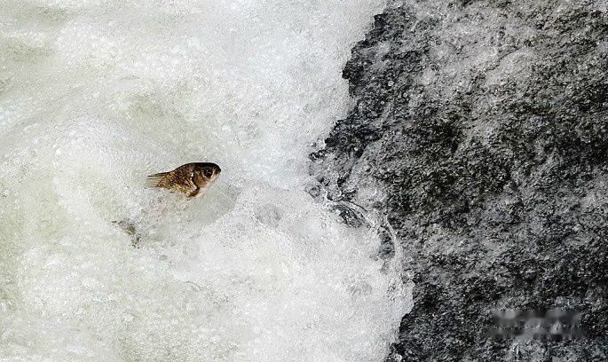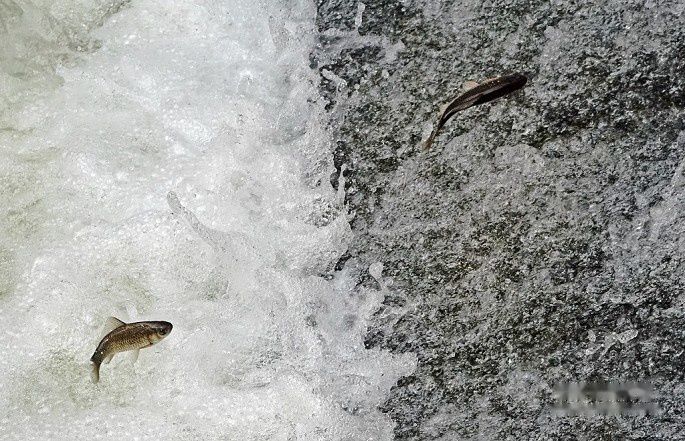 到了那里大失所望,一人也没有。这可是几年来热拍小翠的地点呀,看来今年小翠另觅新家了。正当我要离去时,突然看到两个小水坝处有鱼儿在跳跃,是顶着猛烈的水流向上游冲击跳跃,是典型的鲤鱼跳龙门。这使得我很好奇,就站在那里欣赏了半小时。
