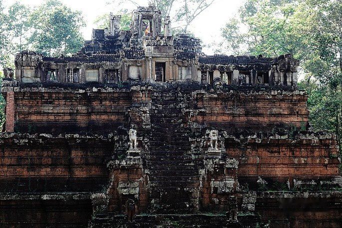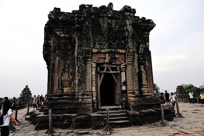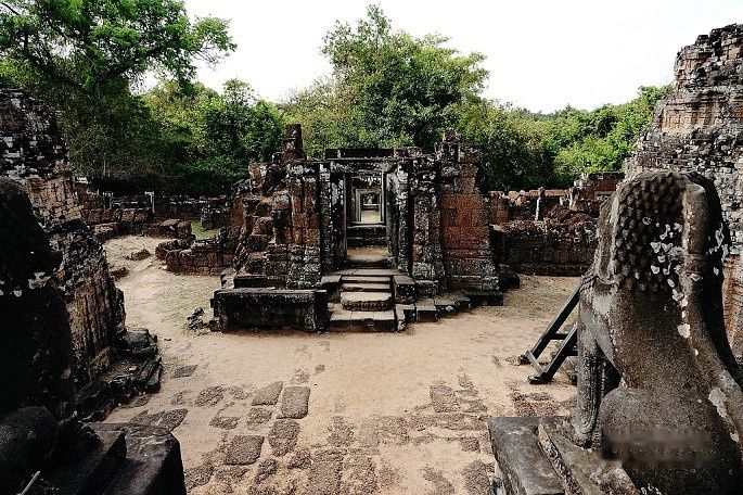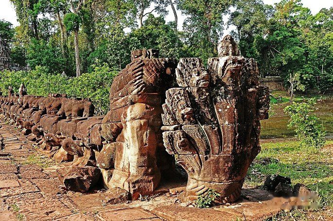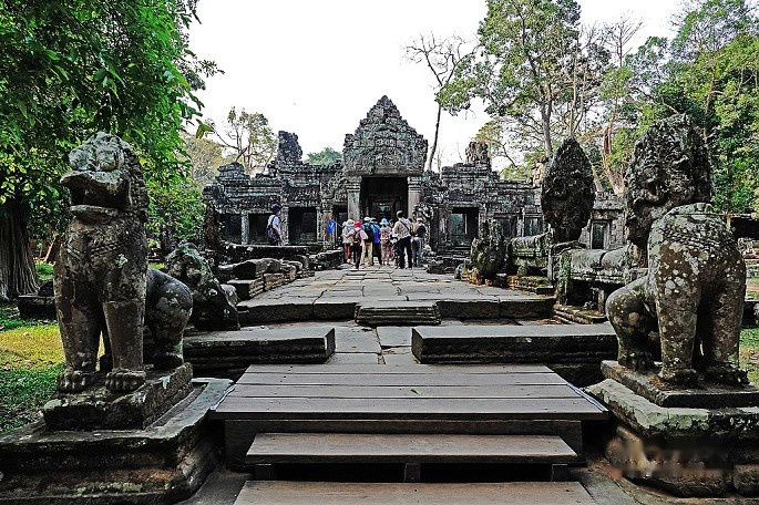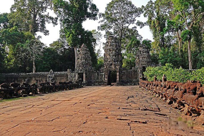 圣剑寺——传说中,阇耶跋摩二世给了他的继承人一把圣剑,这里故名圣剑寺。圣剑寺紧邻通王城东北方,建于12世纪,是佛僧居住和学习的地方,也曾是阇耶跋摩七世重建吴哥城时的暂住地。圣剑寺规模宏大,结构复杂,有着错综复杂的拱状长廊,精美的雕刻作品和长满青苔的巨石。它与塔普伦寺的结构相同,形成了完美的对应,但圣剑寺的保存相对完好,通常这里的游客也相对较少。从西门进入,游览过寺庙后由东门离开,这样可以少走路,同时也节省时间。圣剑寺,同吴哥古迹群的众多大型遗址一样,有漫长的神道直通主体建筑。神道两侧是湿婆风格的雕塑,每侧有56个。基座部分是“毗湿奴”的坐骑“迦鲁达”的形象,上部雕刻了佛祖的形象,但是大多数佛像都遭到了破坏。