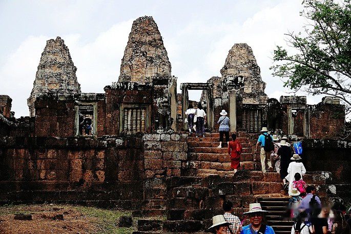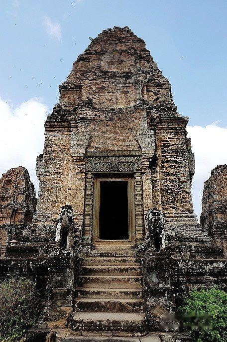 东梅奔寺——始建于公元953年,是罗贞陀罗跋摩二世(Rajendravarman II)修建的一座祭祀父母的寺庙。它位于人造东湖(East Baray)中央的一座小岛上,当时进庙还必须乘船上岛,据考证,现在进入东梅奔寺的大门外的石台阶就是当时上岸进庙的码头。但现在湖水早已经干枯,东湖也变成了农田,昔日的小岛也已变作微微隆起几乎觉察不出的小山丘。