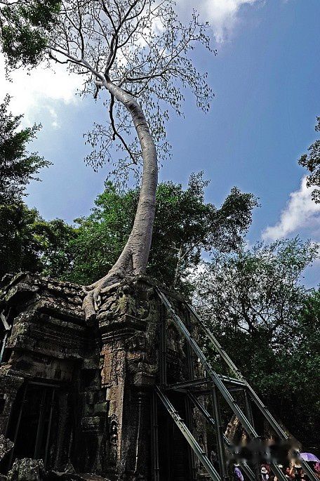 这是一座在丛林中被发现的寺庙,到处是高大的榕树和一种当地称为银皮树的大树,那些大树的根如蟒蛇般包住了寺庙的建筑,也因此使得建筑倒塌。随便举目一望都是这种景象,有点凄凉。