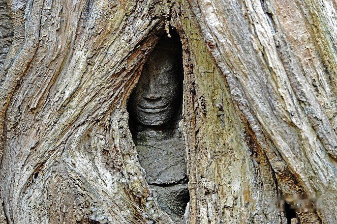 塔普伦寺中的“吴哥的微笑”,是在树洞中的石像