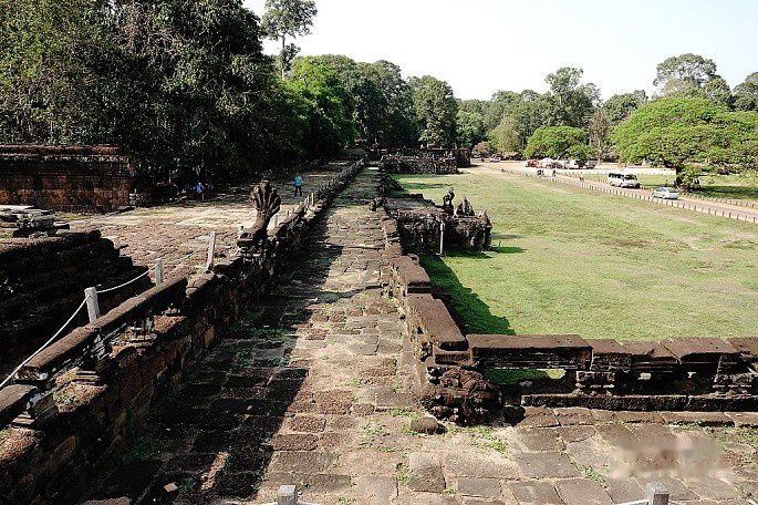 战象台阶——也叫斗象台,位于通王城内,曾是吴哥国王挑选坐骑、检阅及举行庆典仪式的地方。战象台阶共有三个平台,长约350米,高2-3米,长长的基座上雕刻着多个栩栩如生的大象头颅和长长的象鼻。