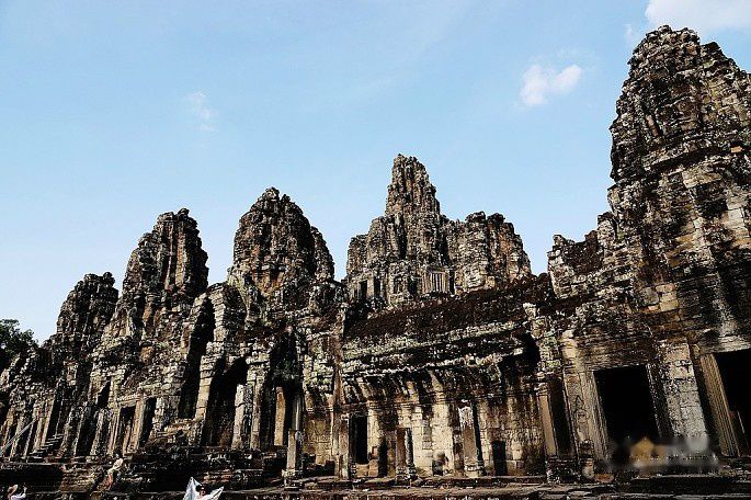 巴戎寺——(Bayon)坐落于吴哥通王城之中心点,其回廊东西长160公尺、南北长140公尺;回廊上方原本皆有木造之屋顶,但由于年代久远,目前只剩下断垣残壁及巨大之石柱供后人凭吊。