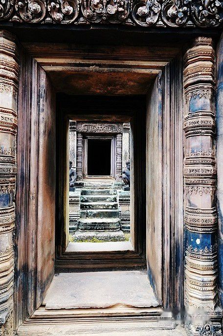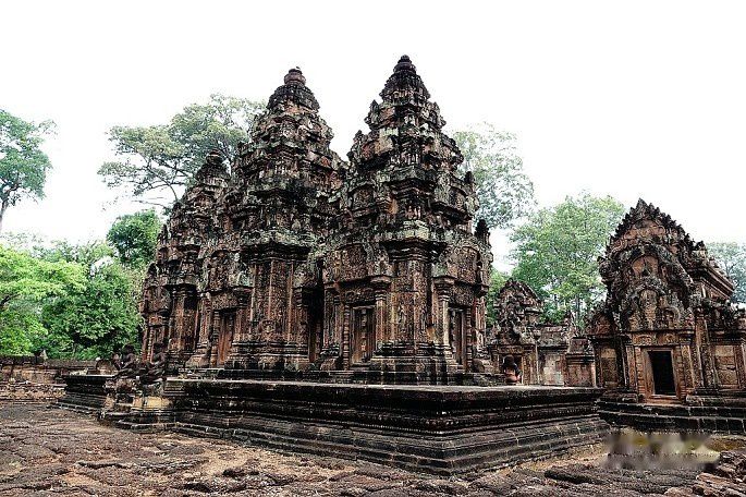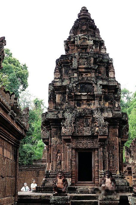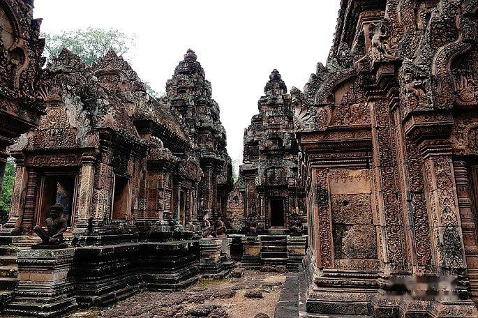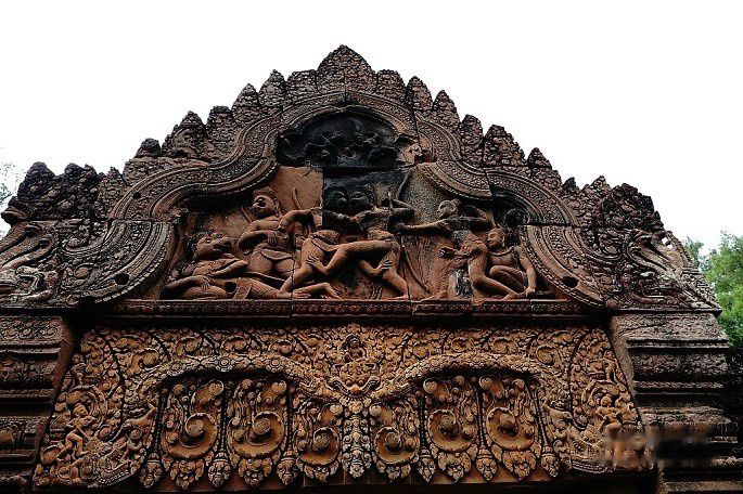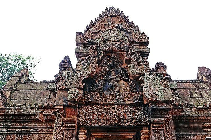 该寺以朱色砂岩构成,充满精致的浮雕,有“吴哥艺术宝石”之称。很多人认为女王宫是吴哥艺术王冠上一颗璀璨的明珠。第一眼你可能会因其规模而感到失望,然而一旦身处其间,你就不能不为装饰其门廊和墙壁的精美雕刻深深打动。这些雕刻都围上了绳索。女王宫在暹粒以北32公里处,最好在接近傍晚时分或者清晨(旅游公共汽车到达之前)去参观,因为这时的太阳光线会使粉红的沙石获得最佳效果。