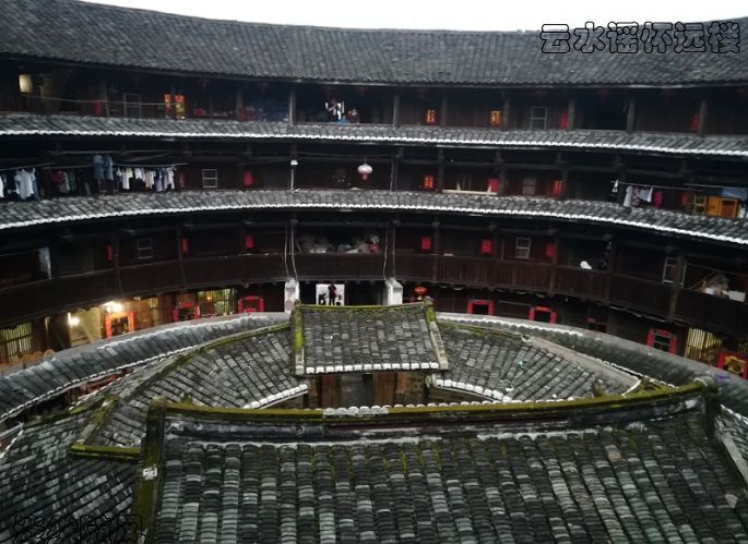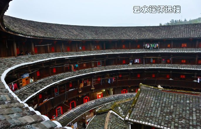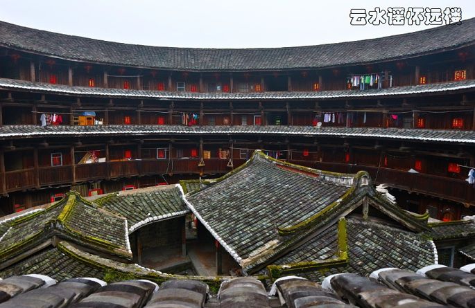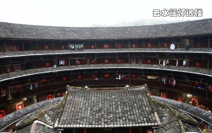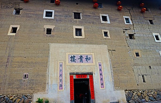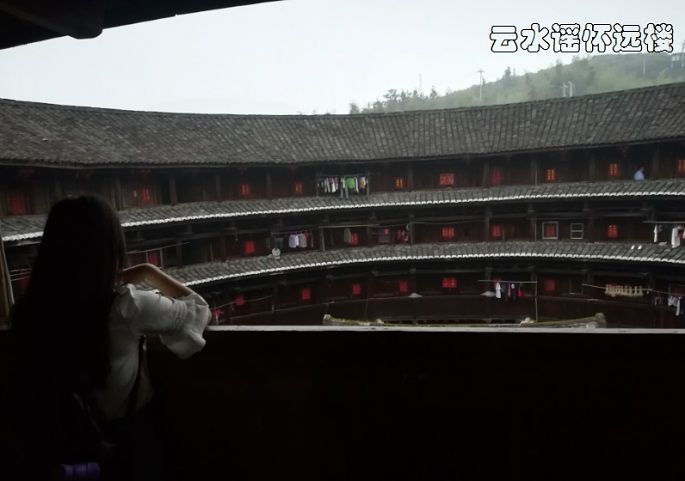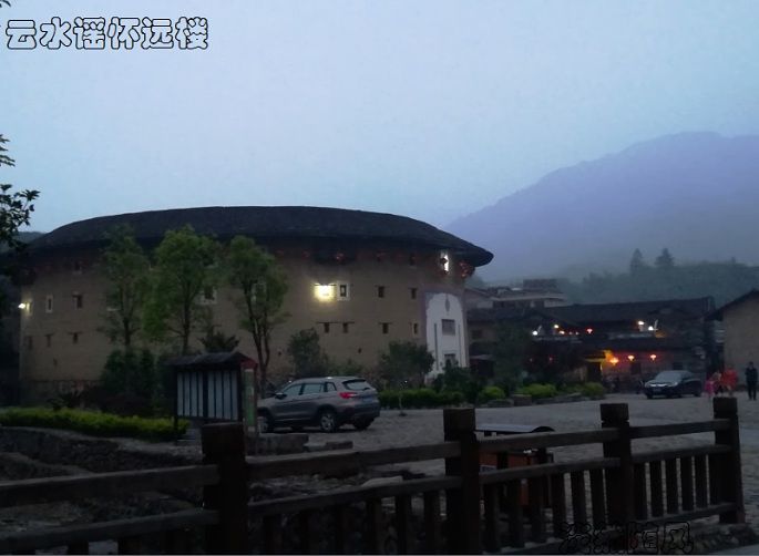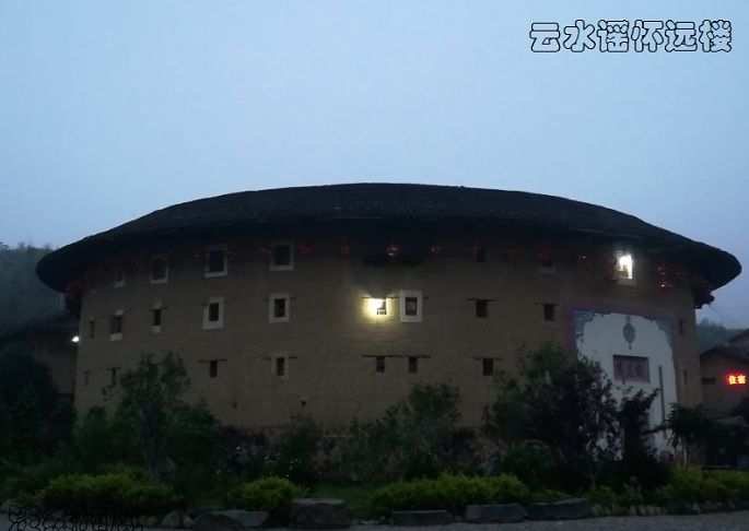 怀远楼,这个名字有两个涵义:一个是楼主来自河北怀杨简氏家族,另一个则是要告诫简氏子孙要胸怀远大志向。它是至今为止保留最完整,构造最精致的双园环土楼,此楼建于清宣统元年(1909年)文化底蕴深厚,文物保护单位,目前已被列入《世界文化遗产名录》。怀远楼整座土楼只有一个大门,大门顶上绘有八卦,两侧楹联上书“怀以德敦以上籍此修齐遵祖训,远而山近面水凭兹灵秀育人文”。