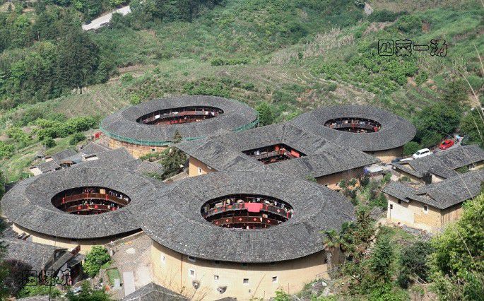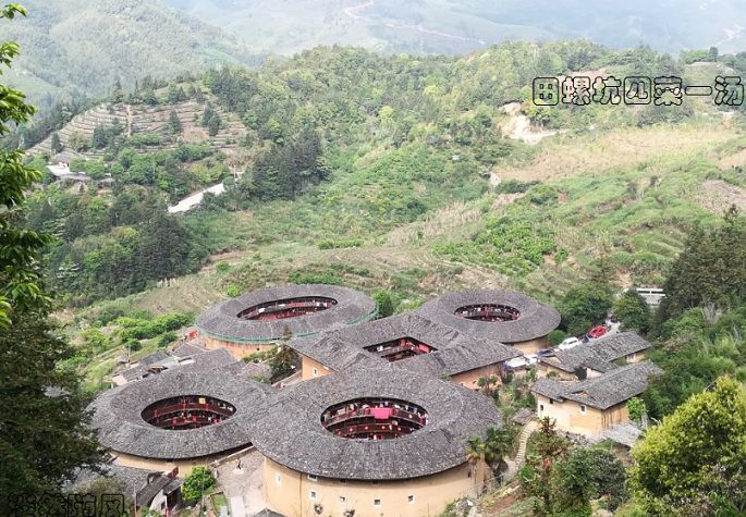 五座土楼依山势错落布局,在于群山环抱之中,从制高的山顶观景台向下俯瞰,四座圆楼簇拥着一座方楼,像一朵盛开的梅花点缀在大地上,又像是飞碟从天而降,构成人文造艺与自然环境巧妙天成的绝景,不失为民居建筑百花园中的一朵奇葩!据说,这南靖土楼被人所熟知,是源于上世纪60年代美国中情局的一个误会:美国通过卫星发现闽西南山中有数量惊人、规模庞大的类似导弹发身架的建筑,于是1985年美国的贝里夫妇以访问学者的身份来到田螺坑土楼群考察,这才发现原来这里只是土楼民居,于是南靖土楼就这样被揭开它神秘的面纱。而现在很多国外游客到福建游玩,总不会错过福建土楼。