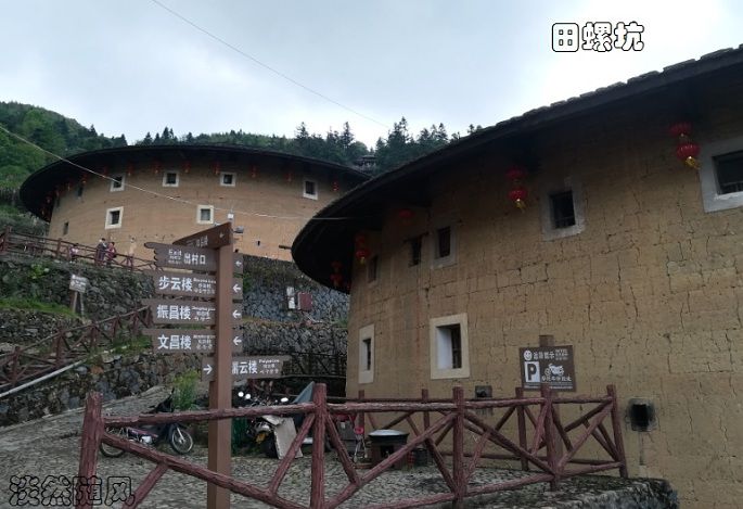 田螺坑景区其实就是一个古老土楼村落,而田螺坑土楼群则是由一座方形土楼“步云楼”,三座圆形土楼“和昌楼”、“瑞云楼”及“振昌楼”,一座椭圆形土楼“文昌楼”组成。此外村内还建有一些土木结构的平房和楼房。