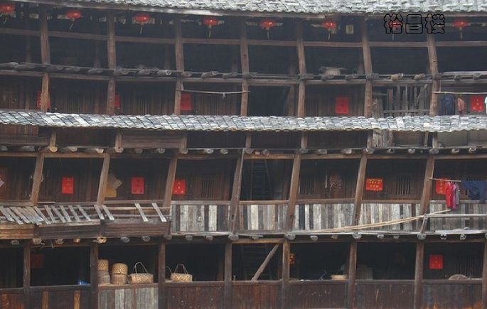 土楼这种建筑是当年当地百姓为了抗击倭寇盗贼而创造出来,依险而筑起,所以它的外围是平滑的,以或圆或方的不同姿态高高耸立在山脚下,高处一个个的窗户便于探视外部情况。裕昌楼,整个土楼就一个大门进出,外墙的一楼和二楼不开设窗口,三楼以上才开设些小窗户,这也为了防盗防敌所需。