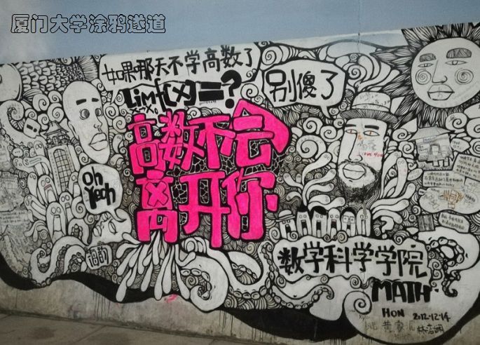 芙蓉隧道,全长1.1公里,宽8米,高4.5米。在芙蓉餐厅旁边,是一条涂鸦隧道,被喻为是中国最文艺最长的一条隧道。在这里,各院系学子展其华,墙上的创意涂鸦,色彩斑斓,形式各异,这些涂鸦大都充满大学青春里经历过的点点滴滴,有想念,有励志,有初恋,有二次元,有热血,有人文。唯一美中不足的是,里面的涂鸦很多都被破坏,惨遭“到此一游”。